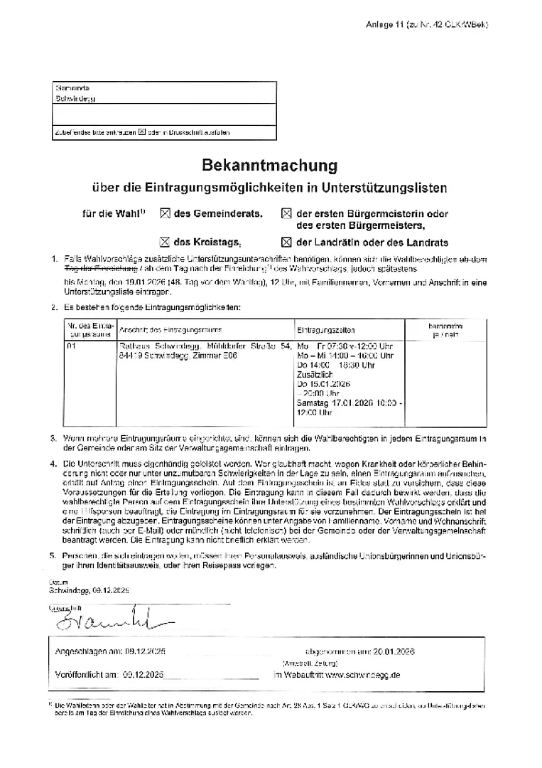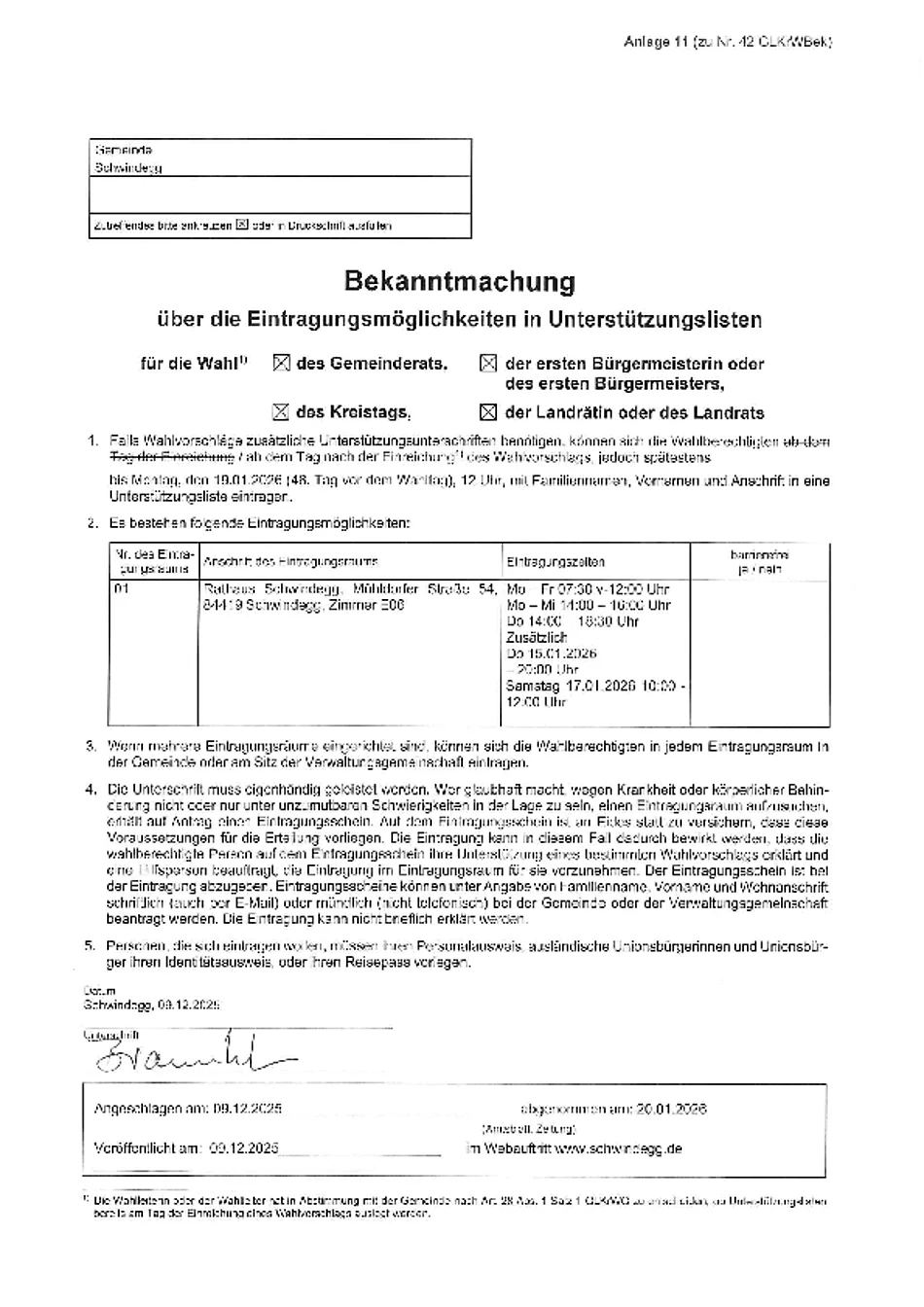 Die Eintragungsmöglichkeiten für die Unterstützungsunterschriften für neue Wahlvorschläge zur Kommunalwahlen am 08.03.2026 wurden festgelegt.